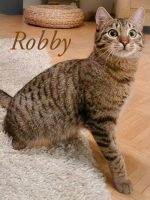 Evie und Robby wurden von einer zahmen Katze auf einem Gartengelände geboren. Sie haben sich schon gut an den Menschen gewöhnt, sie sind neugierig, spielen gerne und nehmen auch schon Leckerchen aus der Hand. Das angefasst-werden hat Evie seit einigen Tagen für sich entdeckt. Seitdem wird gekuschelt und gestreichelt, was das Zeug hält.